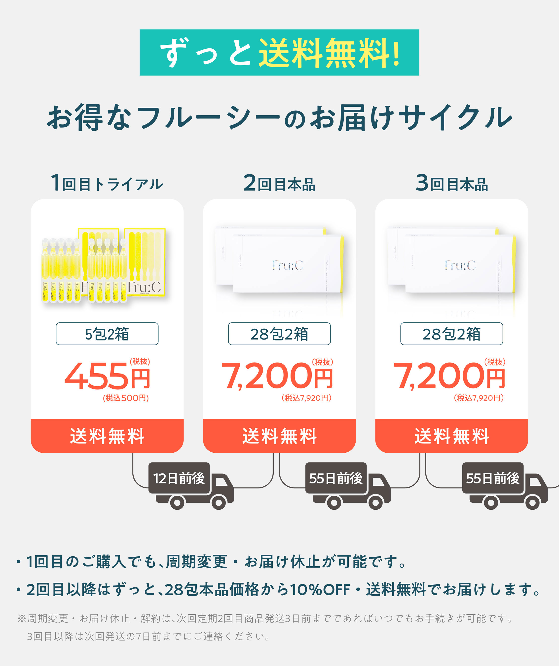※初めてご購入のお客様のみ対象(1世帯1回限り)。定期でお届けする商品ですが、継続回数のお約束はございません。※初回のお届けは、2箱(5包入り/1箱)で500円(税込/送料込)、2回目は初回発送から12日後に2箱(28包入り/1箱)で総額7,920円(税込/送料込/1箱あたり3,960円)、3回目以降は55日ごと2箱(28包入り/1箱)で総額7,920円(税込/送料込/1箱あたり3,960円)となります。※周期変更・お届け休止・解約は、次回定期2回目商品の発送日3日前までであればいつでもお手続きが可能です。3回目以降は次回発送の7日前までにご連絡ください。