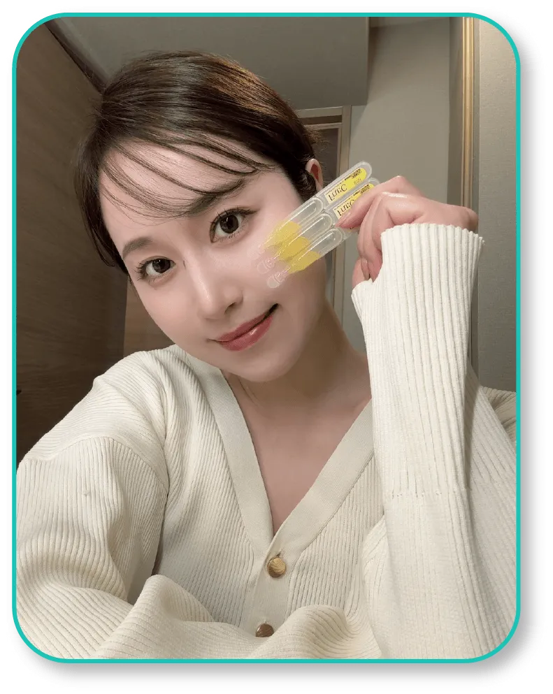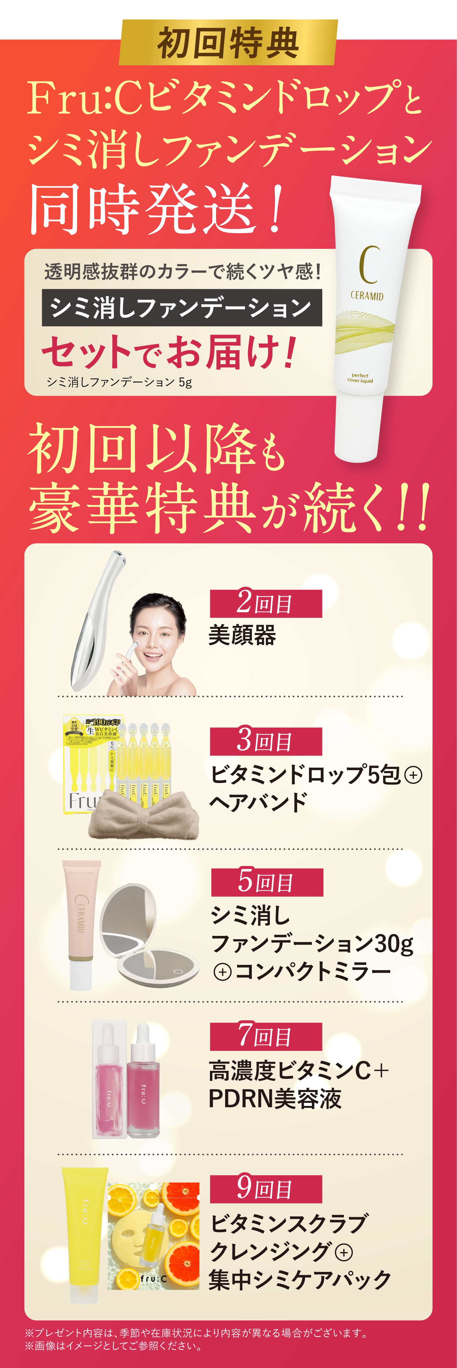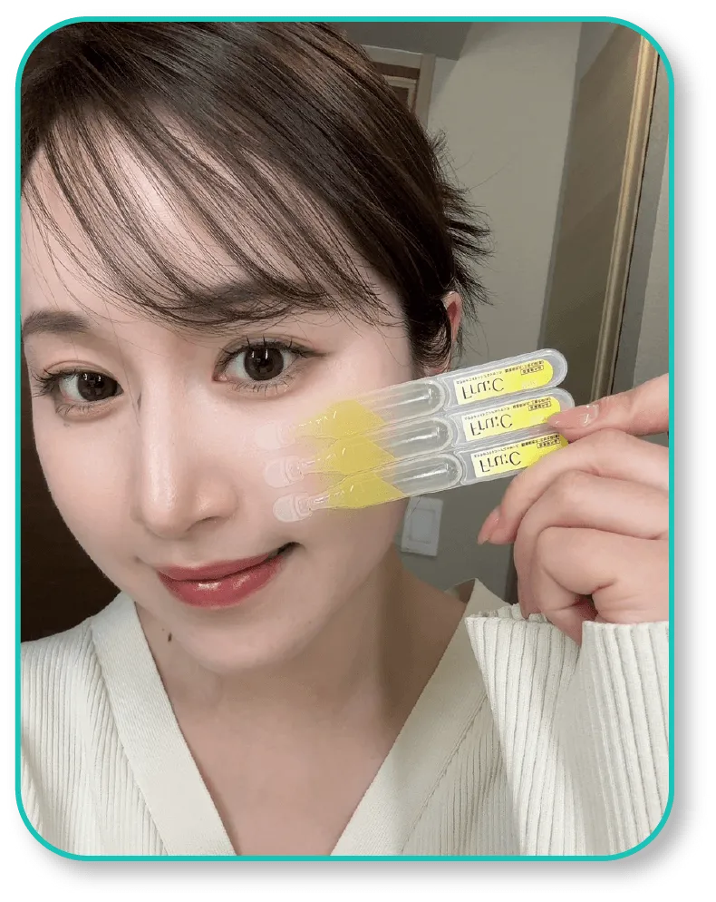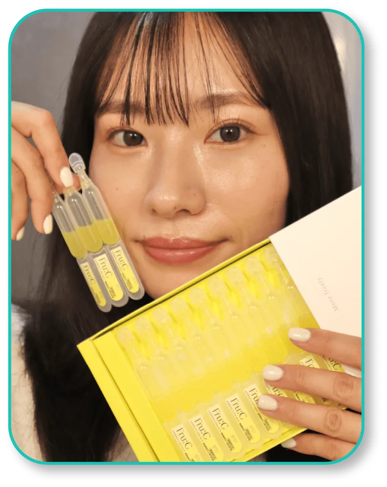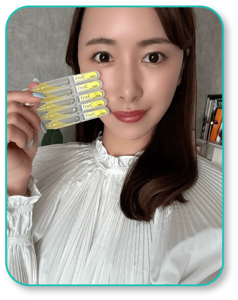 その他成分:リン酸L-アスコルビルマグネシウム、ヒアルロン酸ナトリウム(2)、天然ビタミンE、リノール酸エチル、ユズセラミド、レモン果汁、ライム果汁、オレンジ果汁、グレープフルーツエキス、ニチレイ・アセロラエキスWB、キウイエキス、リンゴエキス、ウメ果実エキス、サンザシエキス、アーティチョークエキス、カモミラエキス(1)、濃グリセリン、1,3-ブチレングリコール、トリメチルグリシン、ポリオキシエチレンメチルグルコシド、1,2-ペンタンジオール、チンピエキス、タイソウエキス、パラメトキシケイ皮酸2-エチルヘキシル、ジグリセリン、パーム油、シュガースクワラン、キサンタンガム、ジェランガム、塩化マグネシウム、クエン酸、クエン酸ナトリウム、エデト酸二ナトリウム、酢酸DL-α-トコフェロール、フェノキシエタノール、香料、精製水