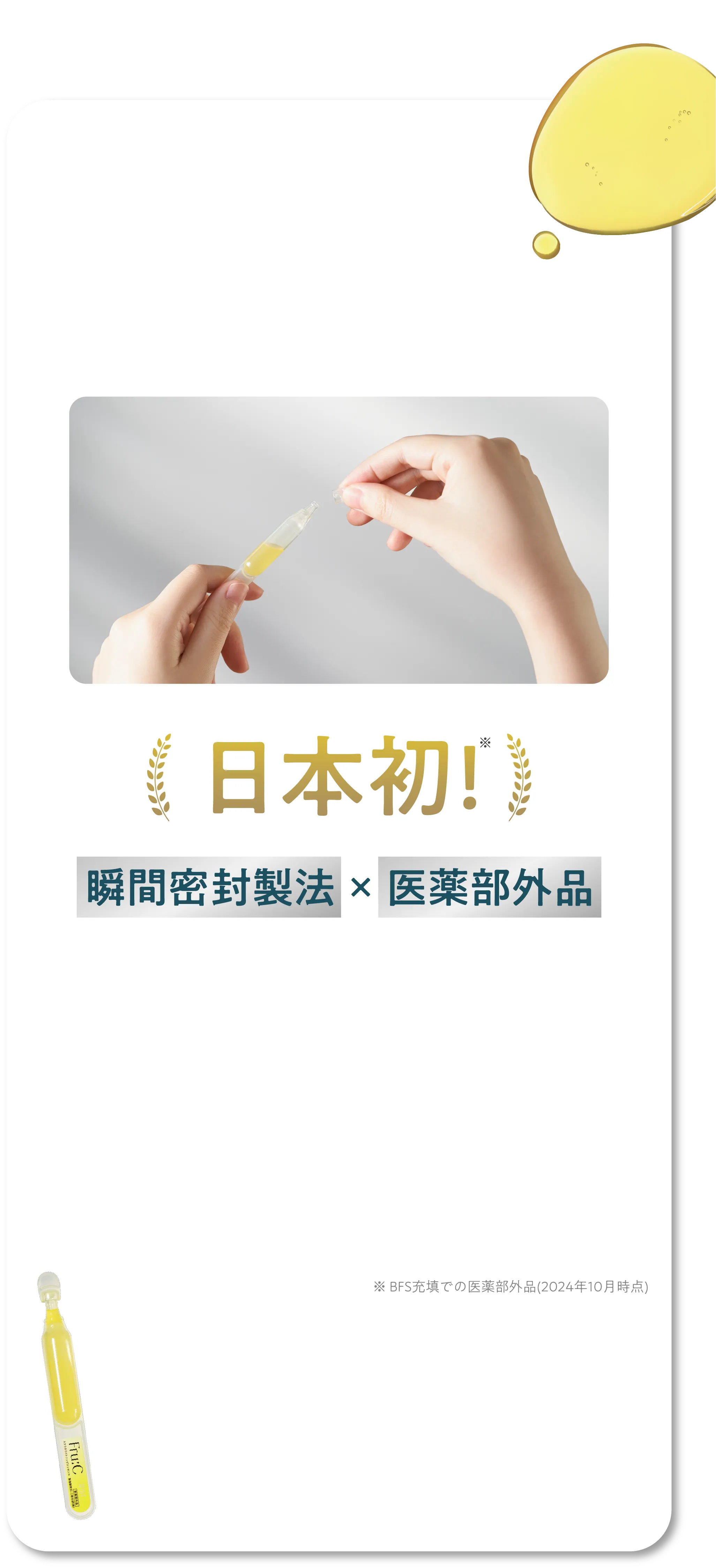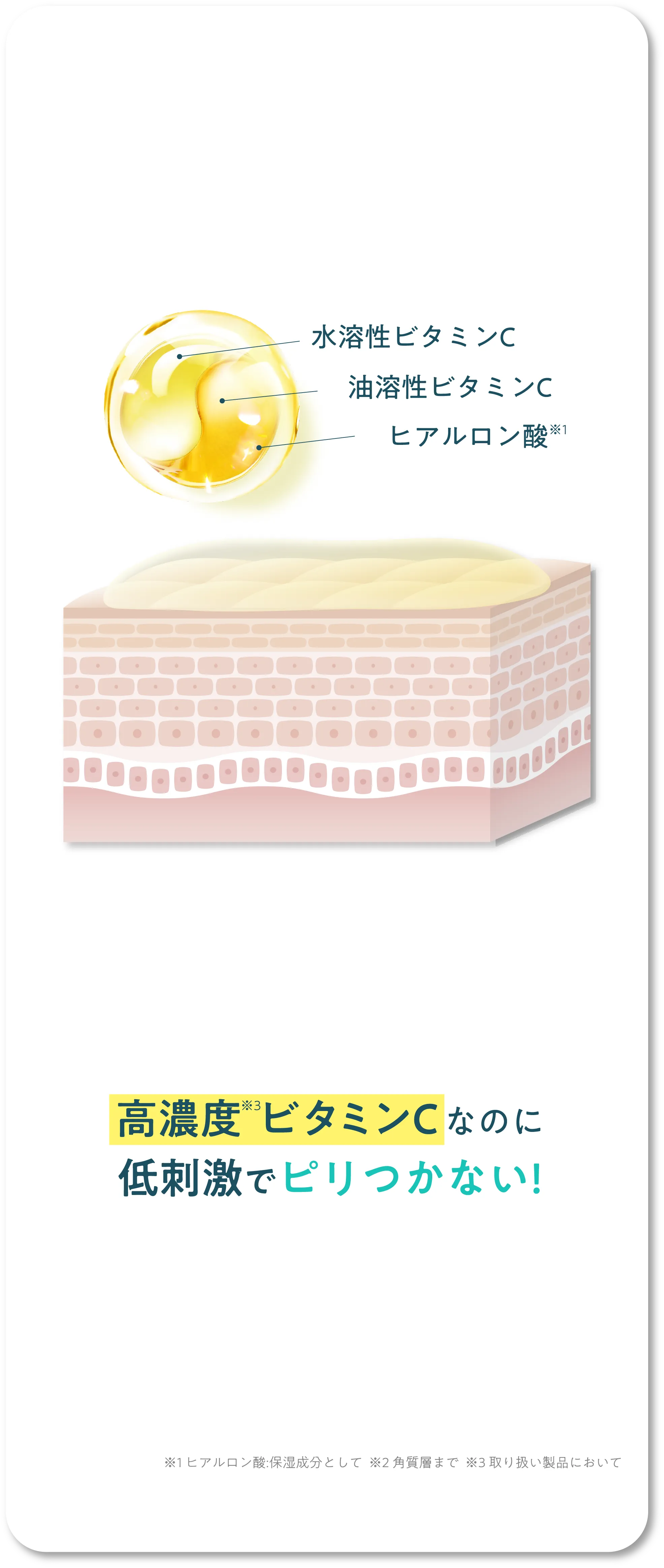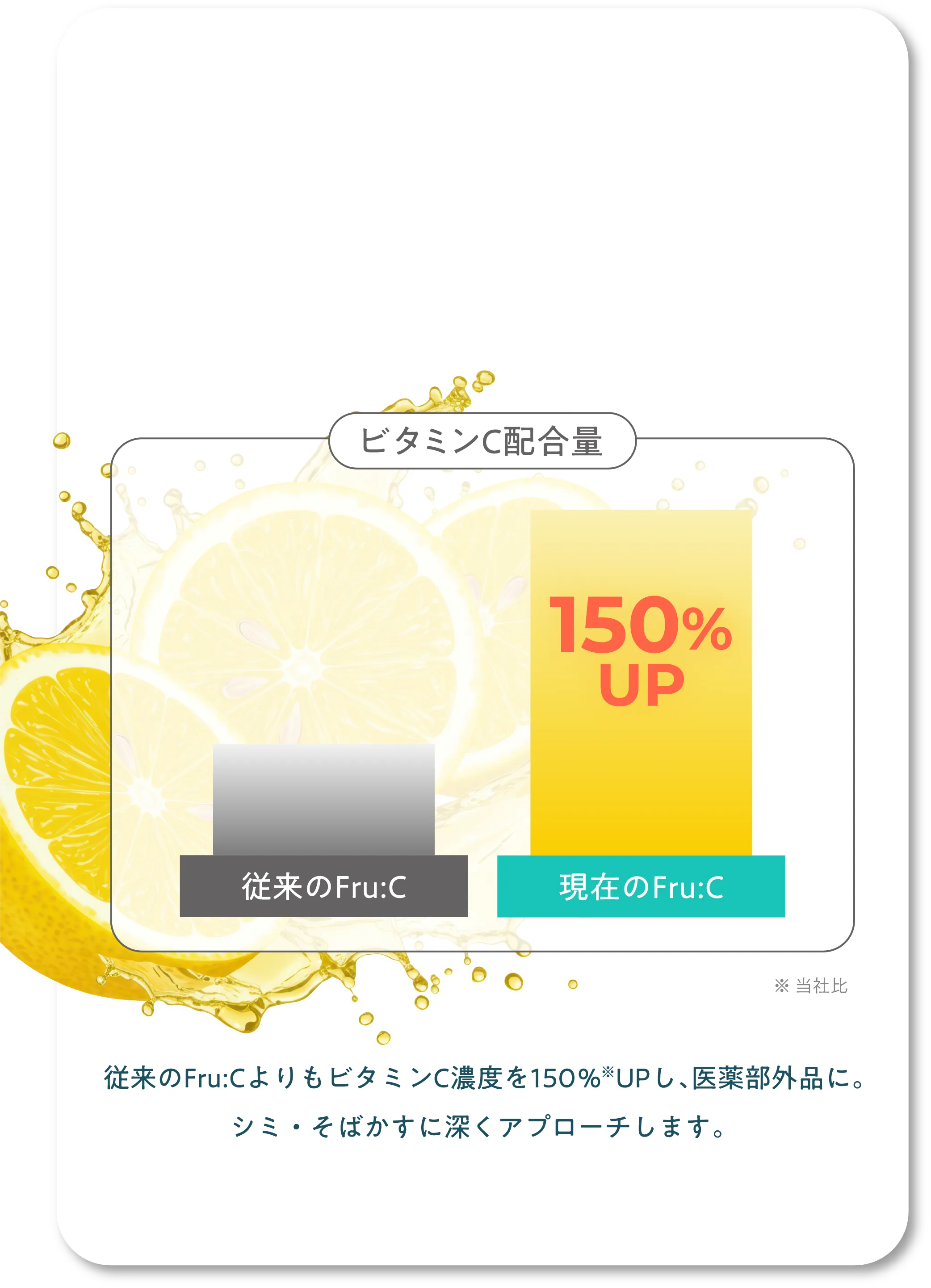 その他成分:リン酸L-アスコルビルマグネシウム、ヒアルロン酸ナトリウム(2)、天然ビタミンE、リノール酸エチル、ユズセラミド、レモン果汁、ライム果汁、オレンジ果汁、グレープフルーツエキス、ニチレイ・アセロラエキスWB、キウイエキス、リンゴエキス、ウメ果実エキス、サンザシエキス、アーティチョークエキス、カモミラエキス(1)、濃グリセリン、1,3-ブチレングリコール、トリメチルグリシン、ポリオキシエチレンメチルグルコシド、1,2-ペンタンジオール、チンピエキス、タイソウエキス、パラメトキシケイ皮酸2-エチルヘキシル、ジグリセリン、パーム油、シュガースクワラン、キサンタンガム、ジェランガム、塩化マグネシウム、クエン酸、クエン酸ナトリウム、エデト酸二ナトリウム、酢酸DL-α-トコフェロール、フェノキシエタノール、香料、精製水