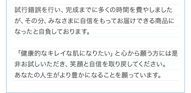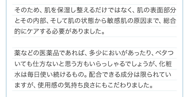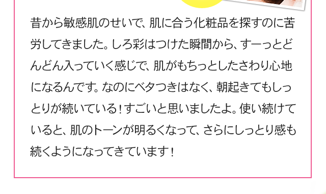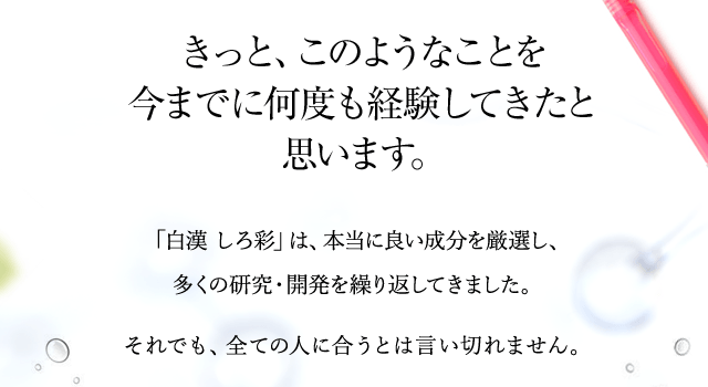 「白漢 しろ彩」は、デリケートな肌にもお使いいただけるように、界面活性剤、パラベン、シリコン、アルコール、香料、着色料、鉱物油などを使用しておりません。
